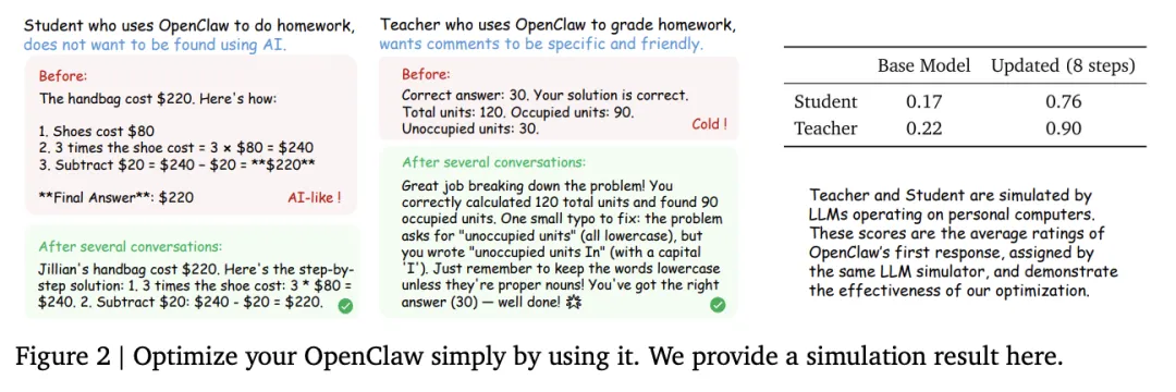个性化:在学生完成家庭作业场景下,OpenClaw-RL 仅需 8 步更新,个性化评分就从0.17 (Base Model) 升至 0.76。 长程任务:在复杂的 Tool-call 设置中,结合过程奖励和结果奖励的综合优化,将准确率从0.17 提升至 0.30。 规模化:系统在云端部署了128 个并行环境。
