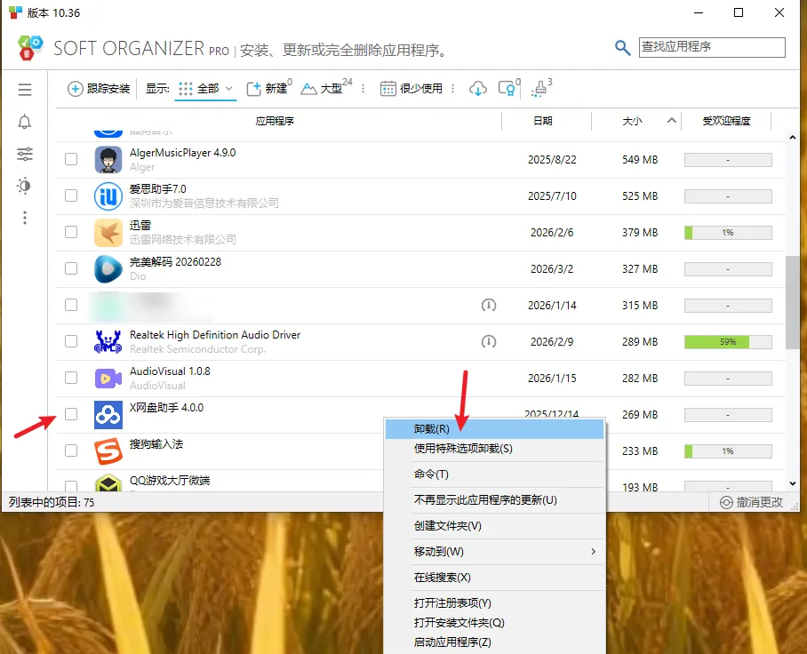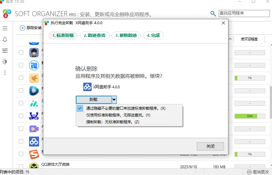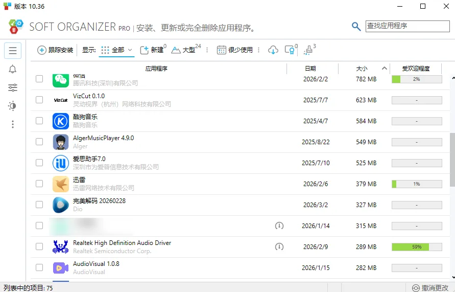 软件的主界面如下,整体非常的干净整洁,支持多国语言,操作起来没有任何门槛。你可以在这里看到电脑上安装的所有软件,它比系统自带的控制面板要详细得多,右键选中一个软件,点击卸载,它不仅会调用软件自带的卸载程序,更重要的是,在卸载完成后,它会自动扫描残留的文件和注册表项,帮你一键清理,实测了一下,能清理出不少垃圾,那种瞬间释放的感觉,特别的棒。