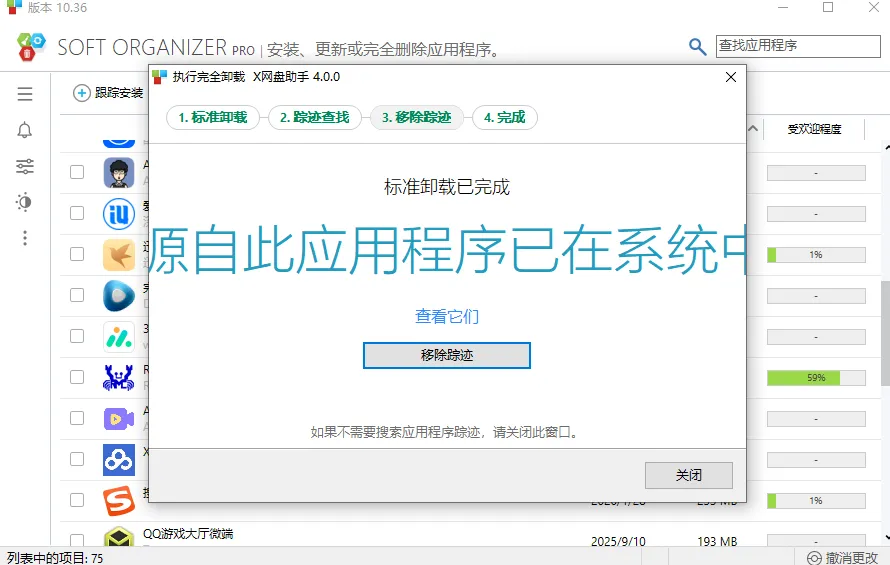 整体的使用体验还是很不错的,简简单单,没有任何多余的东西,打开就是干活,完成卸载之后,还能自动扫描残留,这就很灵性,完全不需要你操心,而且软件本身也小,不占地方,放在U盘里随身带着,走到哪用到哪,也不会往系统里乱写东西,喜欢折腾软件的朋友可以好好体验看看。