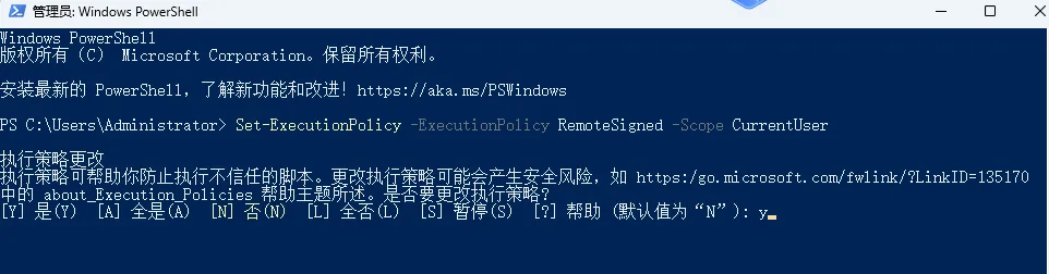 默认不允许运行未签名的脚本,可能会导致 OpenClaw安装脚本无法执行,所以要修改为 “Y”