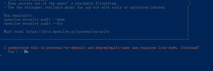 OpenClaw个人用的 AI 助手,默认只信任你一个人,不会随便给别人权限,左右键跳到Yes,回车。