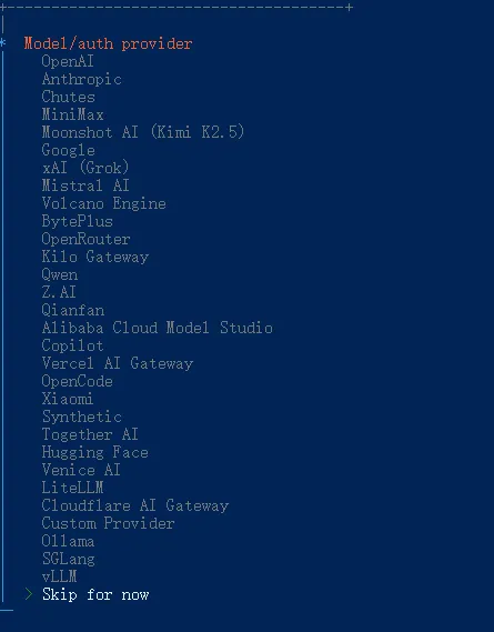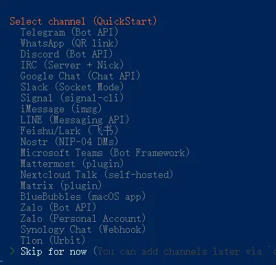 选中Skip for now然后按回车确认,先跳过,我们先把openclaw打通。