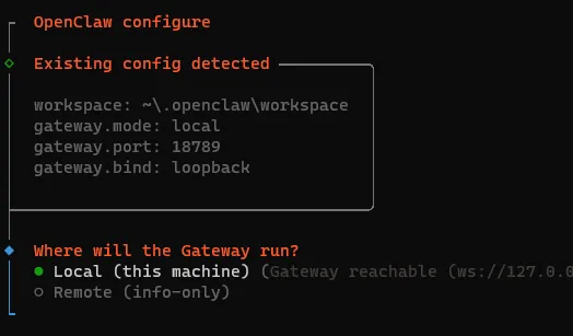openclaw configure回车,选择Local (this machine) 再回车