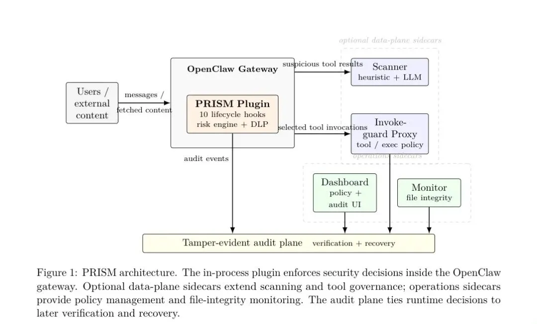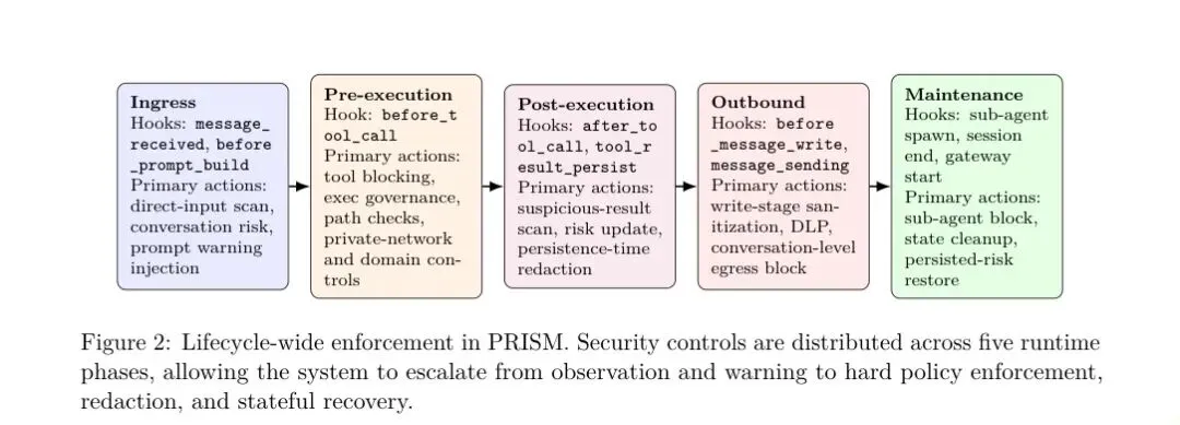 当AI Agent能够访问网页、执行Shell命令、调用外部工具时,一道"输入过滤"已经远远不够用了。来自UNSW Sydney的研究者提出了 OpenClaw PRISM——一个无需修改(Fork)任何底层代码、却能在运行时全生命周期守护LLM Agent网关的深度防御层。它把安全控制分布在10个生命周期钩子上,将检测、拦截、审计与运营工作流融为一体,让Agent网关真正变得可控、可观测、可防御。