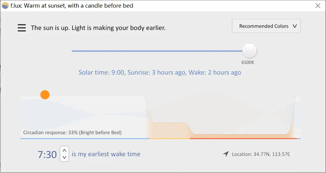轻量到几乎没存在感。 整个软件只有1MB,后台占用内存可以忽略不计。无论你是新买的顶配电脑,还是用了七八年的老机器,装上它都毫无压力。 完全免费,没有任何套路。 没有弹窗、没有广告、没有“付费解锁高级功能”。打开就用,用完即走,干净得像一股清流。 一次设置,一劳永逸。 安装时简单选择一下你所在的城市(或者输入经纬度),f.lux就会根据当地的日出日落时间自动调整色温。从此以后你什么都不用管,它自己默默工作。