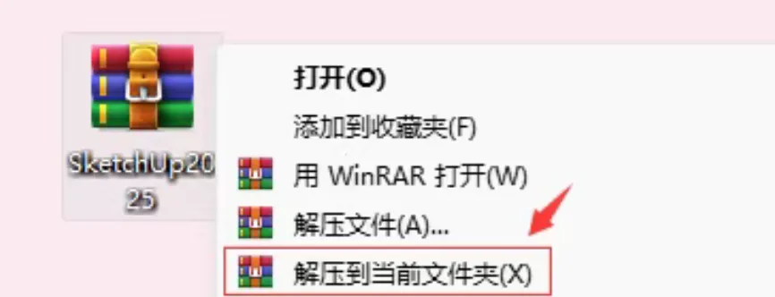 1.找到下载好的Sketch Up2025安装包,解压安装包:①鼠标右击【SketchUp2025】压缩包②选择"解压到当前文件夹"