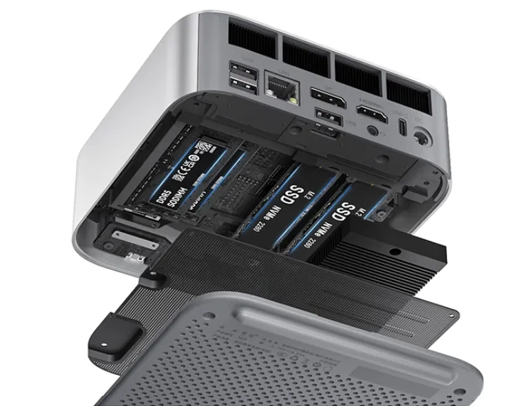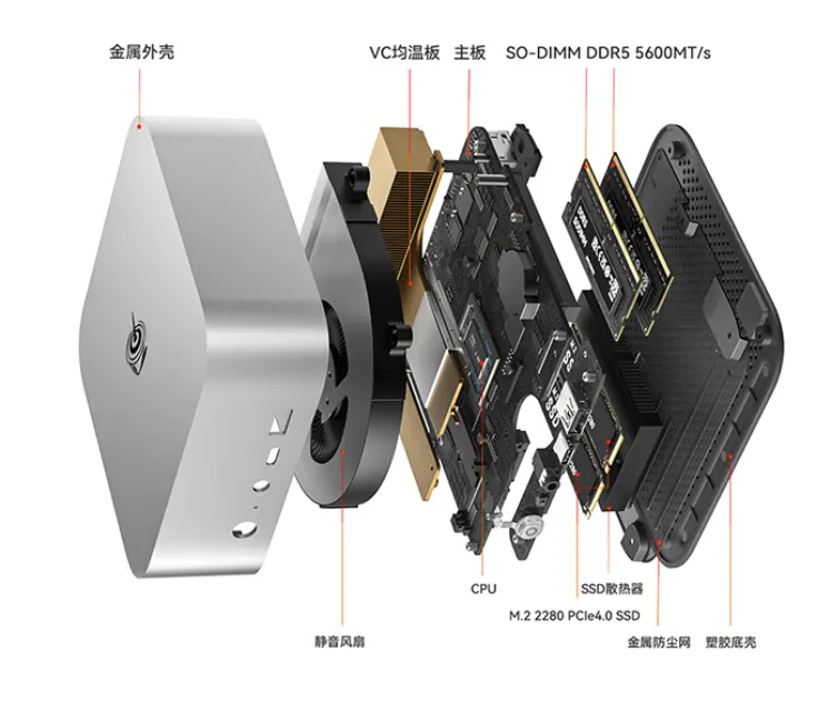 可以选32GB DDR5 5600MT/s版本,配有1TB M.2 SSD,支持双M.2插槽。也可以选无内存、硬盘的准系统版本。