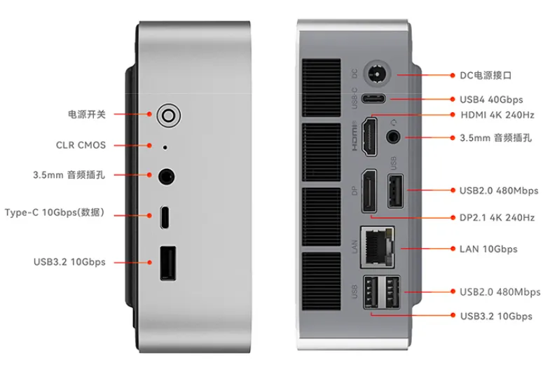 接口有4A2C,包含一个USB4,与另外的HDMI 2.1,DP 2.1接口一起,支持3屏显示,并且支持4K 240Hz输出。这款设计是比较合理的,三个显示器接口都在后侧,方便布线。