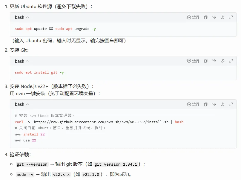 1.Windows新手必用WSL2,Node.js必须装v22+,这是部署成功的核心前提;