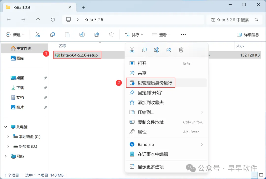 3、找到【Krita v5.2.6 x64-setup】应用程序,右键选择【以管理员身份运行】它