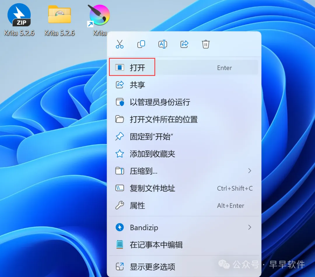 15、回到桌面,右键桌面上的【Krita软件图标】,点击【打开】