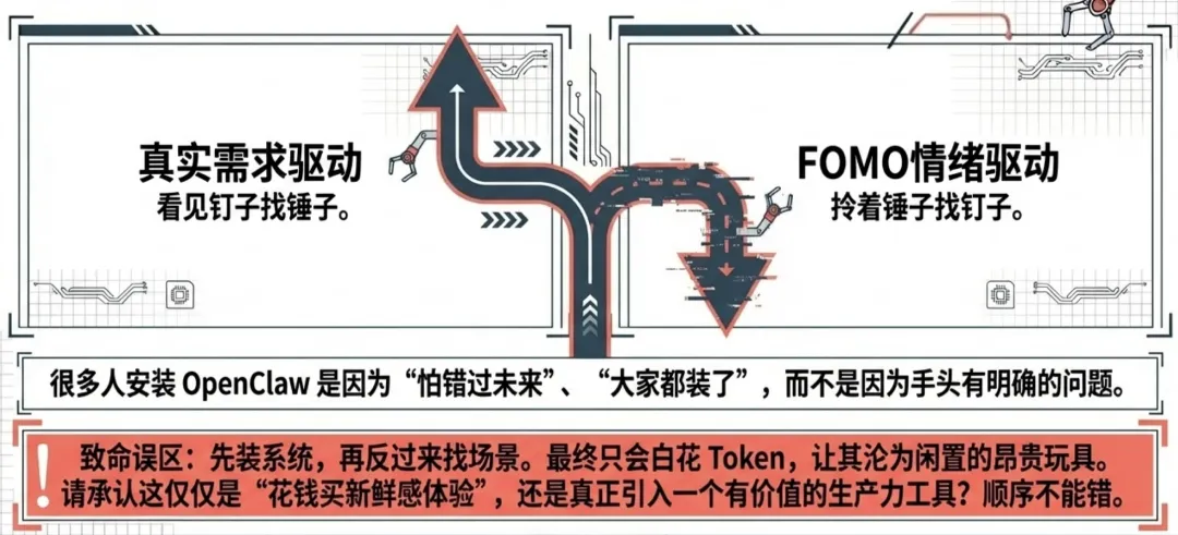 别人都在装,我是不是也该装一个?别人都在“养龙虾”,我是不是也不能落下?这种心理非常正常。但问题在于,很多人是先被这种氛围推着走,装完之后(有些甚至是付费装),才开始反过来问自己:我到底要拿它干嘛?这件事的顺序一旦反过来,就很容易出问题。