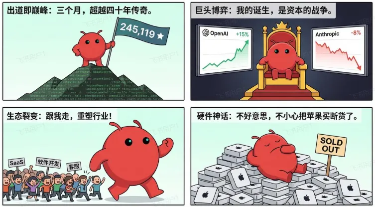 认识OpenClaw小龙虾一、为什么应该关注 OpenClaw? OpenClaw 的爽文男主剧本 GitHub 历史第一:三个月飙到 245,119 星标,超越存在 40 年的 Linux,成为开源史上增长最快项目 OpenAI 收购创始人 → OpenAI 股价暴涨 15%,Anthropic 跌 8%,Google 紧急调整 Android 17 战略 国内外大厂集体跟进,冲击 SaaS 市场(软件开发、客服、市场调研等全行业) 直接导致苹果 Mac Mini 缺货、Mac Studio 高内存版交付从 14 天拉长到 54 天——一个开源项目把苹果电脑买断货 顶级背书