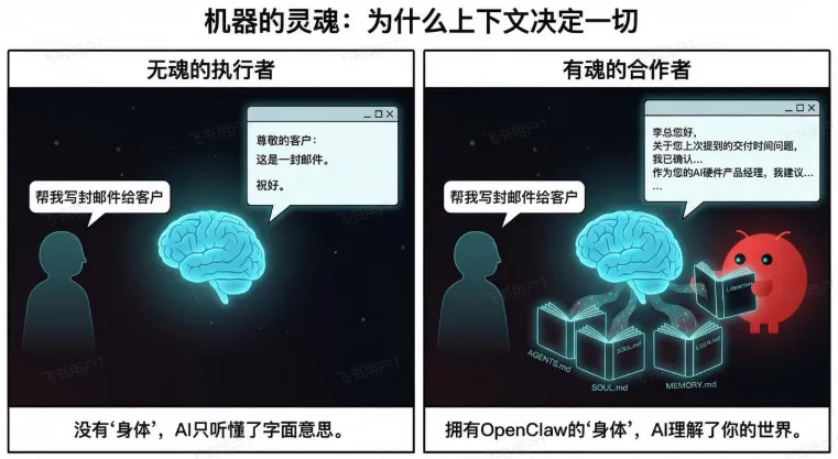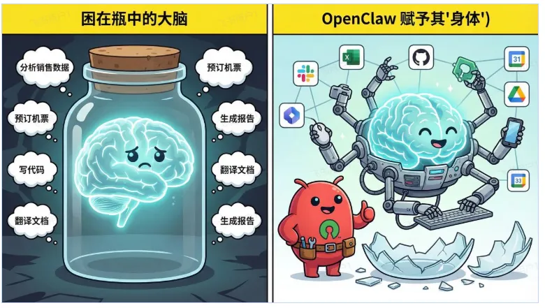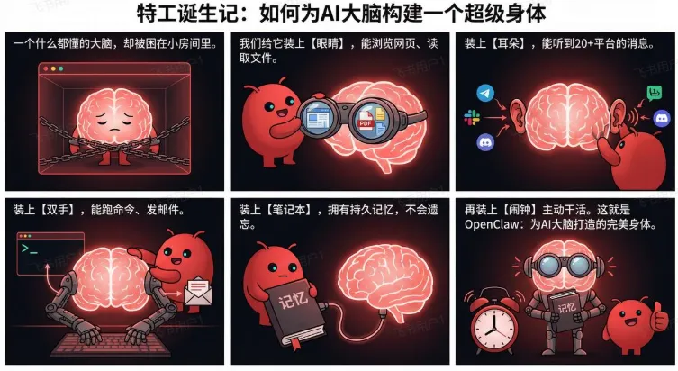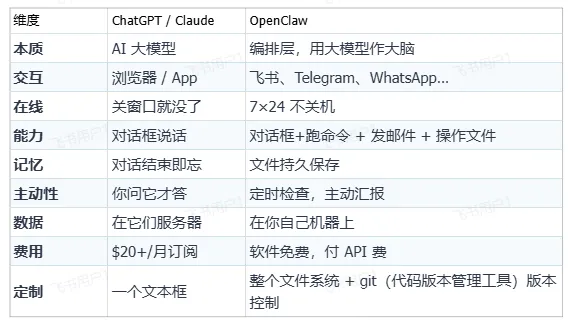 但它踩准时间点,做到了:开源 + 本地优先 + 人人都能拥有完全私有的Agent “这不是更聪明的聊天机器人,这是真正的AI员工。” Clawdbot → Moltbot → OpenClaw 2026年AI从“会聊天”进化到“会干活”,OpenClaw开源本地Agent让每个人拥有24/7的私人AI员工,标志着从聊天时代到行动时代的真正转折。 二、OpenClaw到底是什么? 2.1 一个类比讲清本质 “Claude、DeepSeek 这些大模型是大脑,OpenClaw 是身体。” 大脑什么都懂,但没身体就被困在浏览器窗口里,只能聊天。 耳朵:监听 20+ 平台消息(WhatsApp、Telegram、飞书等) OpenClaw 的本质:给大模型装上能真正“做事”的身体。 ChatGPT/Claude 和 OpenClaw 不是竞争,而是协作 OpenClaw 里面跑的就是 Claude/GPT/DeepSeek,它们当大脑,OpenClaw 提供身体。 你不需要二选一,完全可以同时用:大脑思考 + 身体执行。 2.2 与 ChatGPT / Claude 的对比 给你一个文本框写 system prompt,写完就是一份静态指令,固定不变。 给你一整个文件系统:多个 Markdown 文件各司其职(身份、行为规范、记忆、工具、习惯等),可以随时手动编辑、版本控制、让 AI 自己更新内容。 OpenClaw 的定制 = 给 AI 一本不断更新的活笔记 2.3 六个核心概念 把 OpenClaw 想象成一家一人公司,AI 是唯一的员工 ①Gateway(网关)