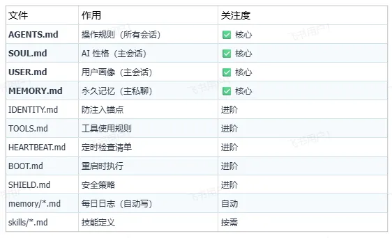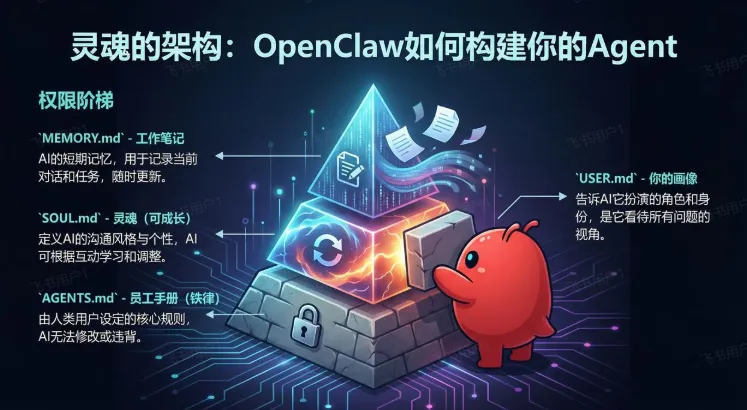 灵魂四件套,每次新对话启动前固定加载,像操作系统内核: AGENTS.md→ 员工手册(铁律,人类锁定,不可改) SOUL.md→ 灵魂/人格(可成长,AI 可自己更新) 权限阶梯:AGENTS.md > SOUL.md > MEMORY.md 邮件场景示例