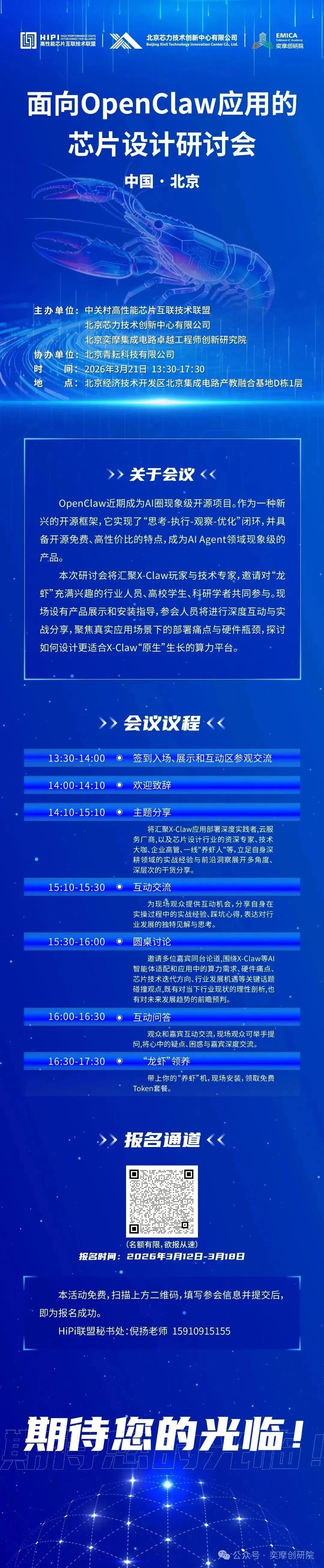 本次研讨会全程免费,面向所有对OpenClaw感兴趣的行业从业者、高校学生、科研学者开放。报名时间为2026年3月12日-3月18日,名额有限,欲报从速!扫描报名二维码填写参会信息,提交后即为报名成功。