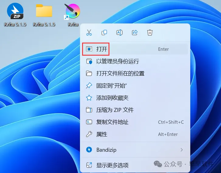 15、回到桌面,右键桌面上的【Krita软件图标】,点击【打开】