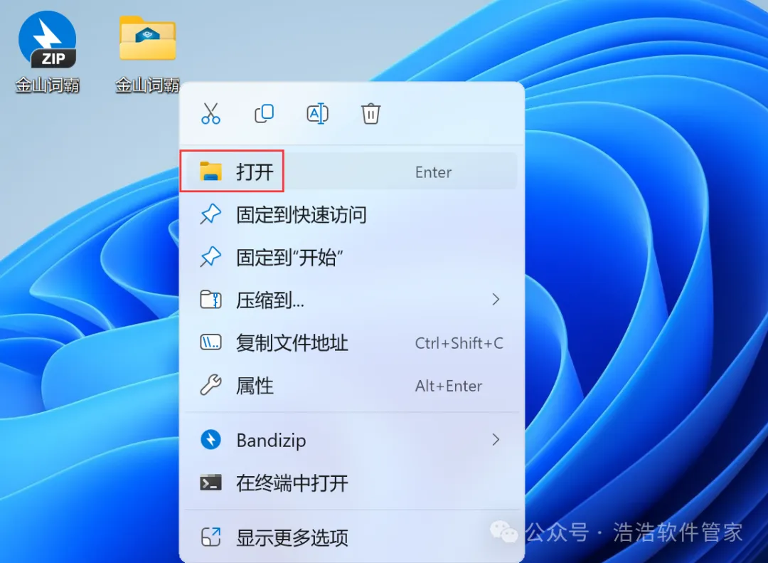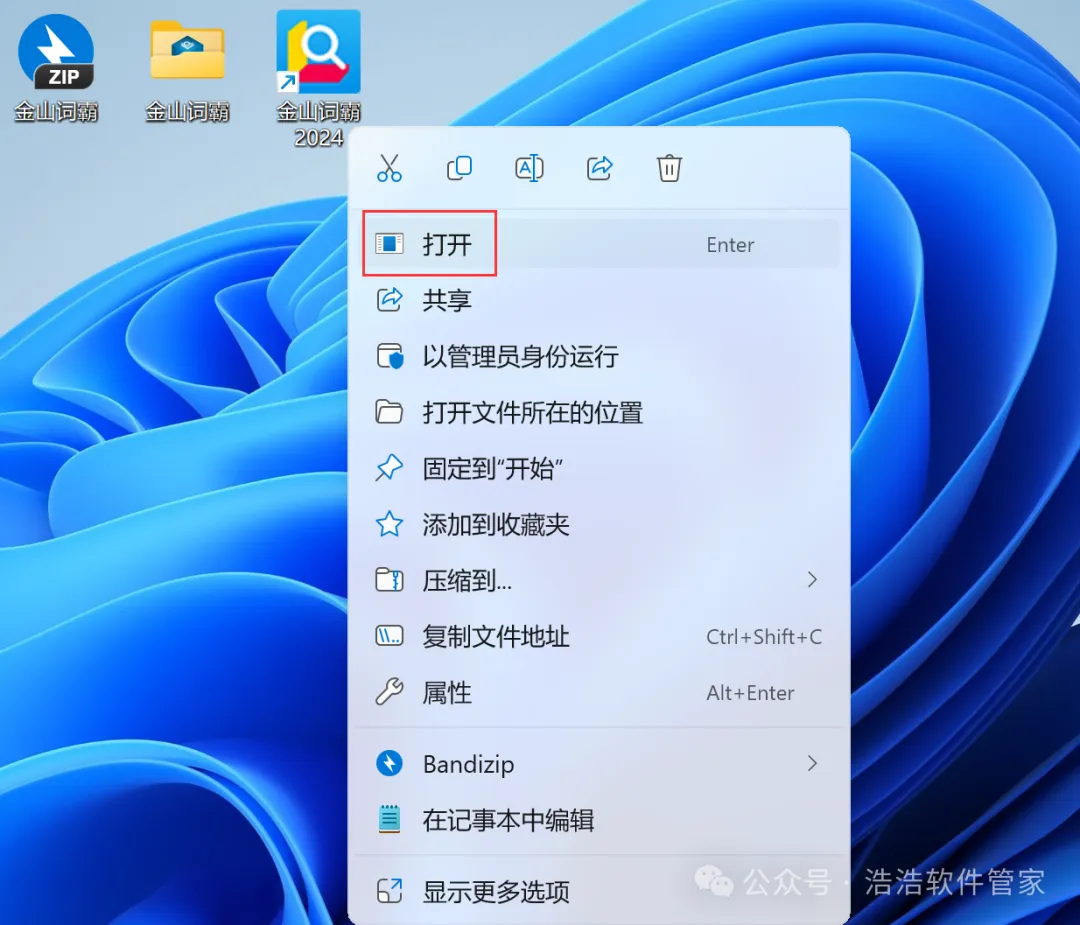 7、回到桌面,右键桌面上的【金山词霸软件图标】,点击【打开】
