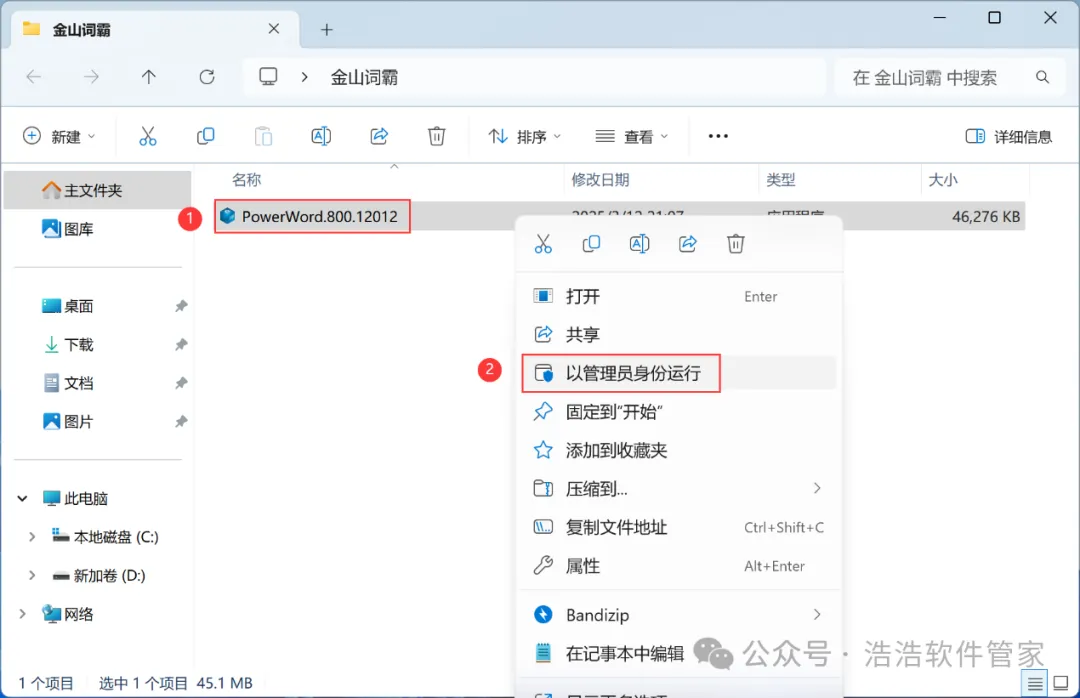 3、找到【金山词霸】应用程序,右键选择【以管理员身份运行】它