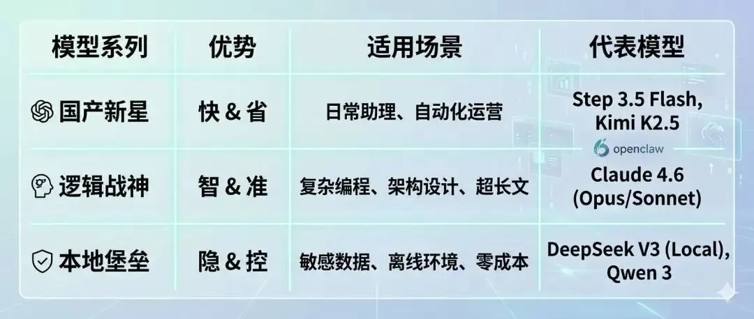 追求"快"与"省"(如自动化运营、日常助理) → Step 3.5 Flash / Kimi K2.5(当下的"养虾"标配) 追求"智"与"准"(如复杂编程、架构设计) → Claude Opus / Sonnet 4.6 追求"隐"与"控"(如私密数据、离线环境) → DeepSeek (Local)