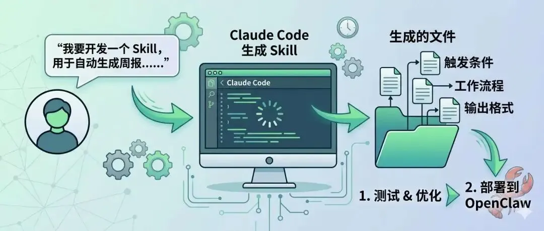 "我想开发一个Skill,用于自动生成周报。输入:本周工作记录输出:格式化的周报,包含完成事项、数据指标、下周计划"Claude Code会帮你生成Skill文件包括触发条件、工作流程、输出格式等