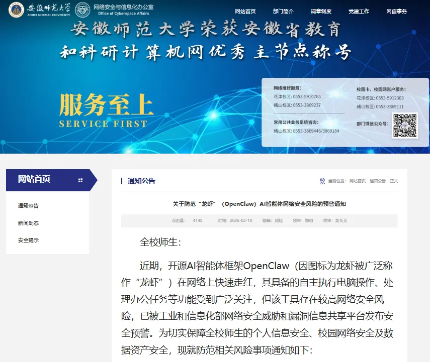 3月11日,江苏师范大学信息化建设与公共资源管理处发布《关于防范OpenClaw安全风险的提醒》。通知提醒师生使用OpenClaw智能体应优先使用云端服务器、虚拟机、容器等隔离技术部署,不要将服务暴露至公网或校园网。