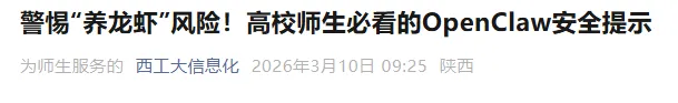3月11日,广东医科大学网络与信息中心发布《关于防范OpenClaw开源AI智能体安全风险的预警提示》提醒高校师生称,部署OpenClaw要注意防护,避免电脑里的毕业论文、实验数据、科研成果,以及个人账号密码、校园信息等,面临被窃取、篡改的风险。