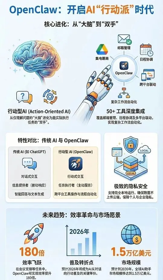 我没有养过龙虾(准确地说是不知道怎么安装),但感觉这个新鲜事物来头不小,因此搜了些视频和文字资料来了解。这款“龙虾”可以帮你打工,安装了一些需要付费的技能包后,再接入现有的主流大模型,就可以在电脑上开始帮你“干活”了。比如说,你想每天接收客户的邮件,然后根据具体需要完成客户的要求,并回复邮件,最后调用数据处理软件形成报表,并将处理结果及结论用最简练的语言汇报给你……这就只要在“小龙虾”的对话框中输入一句话就行了。剩下的事情就全部交给“小龙虾”完成,中间都不需要人工干涉,非常方便。而以前的人工智能一般都是对话式的,你问一句它给你方法,但没有帮你执行出来,就好比“光说不练”。