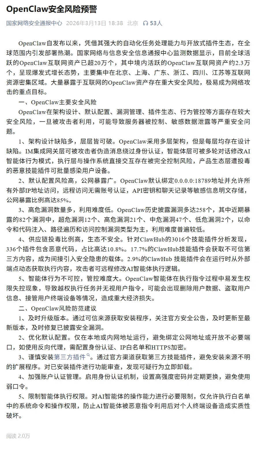 3月13日晚,国家网络安全通报中心发布《OpenClaw 安全风险预警》。通报指出,OpenClaw 自发布以来,凭借其强大的自动化任务处理能力和开放式插件生态,在全球范围内迅速流行并被广泛部署。