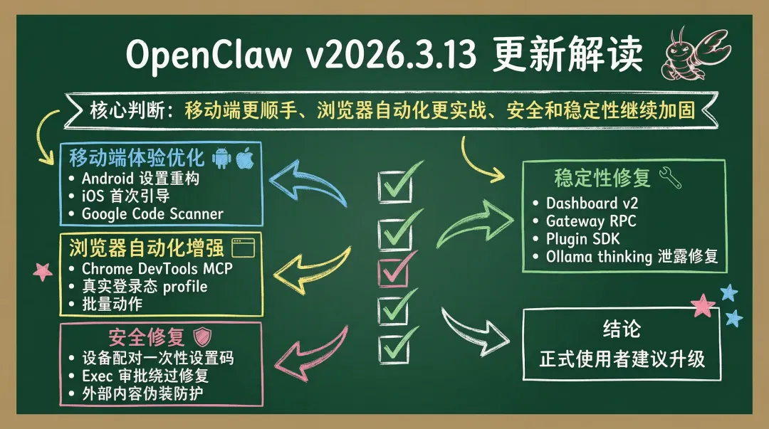v2026.3.13 包含 50+ 项改进,最值得关注的是移动端体验重构、浏览器自动化接入真实登录态 Chrome,以及 8+ 项安全修复和一批 Dashboard / RPC / 多平台稳定性问题修复。
