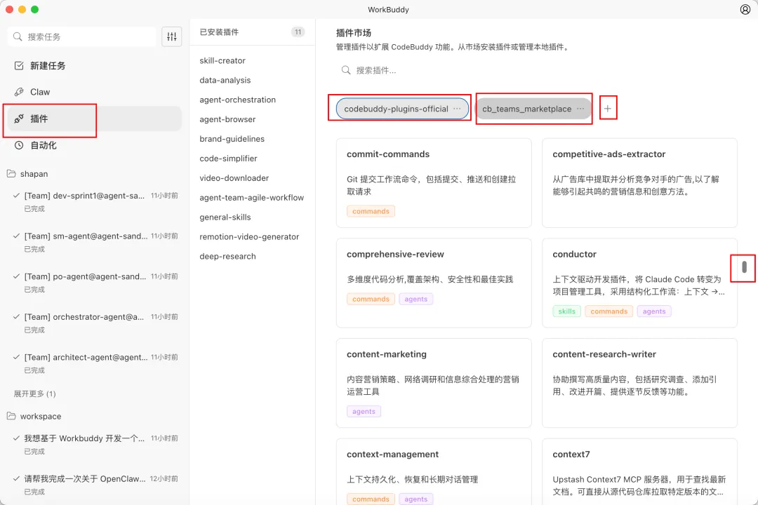 如果你觉得内置的 Skills(技能插件) 还不够用,WorkBuddy Claw 也支持 自定义插件市场。