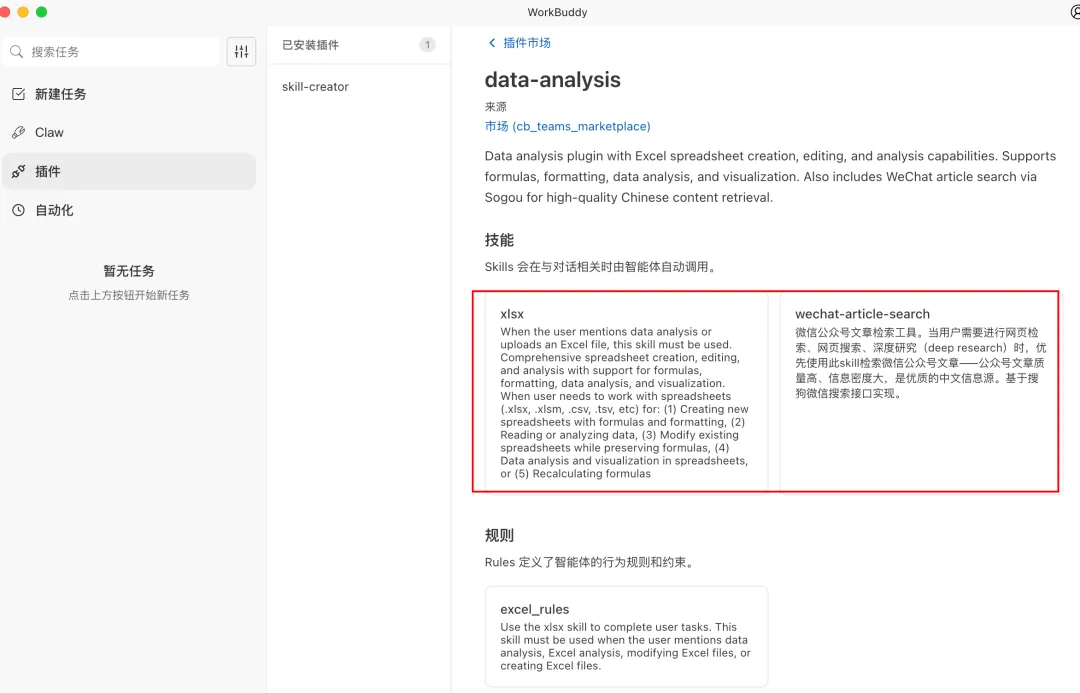 在扒拉WorkBuddy内置的Skills时,我发现了一个叫data-analysis的宝藏插件。
