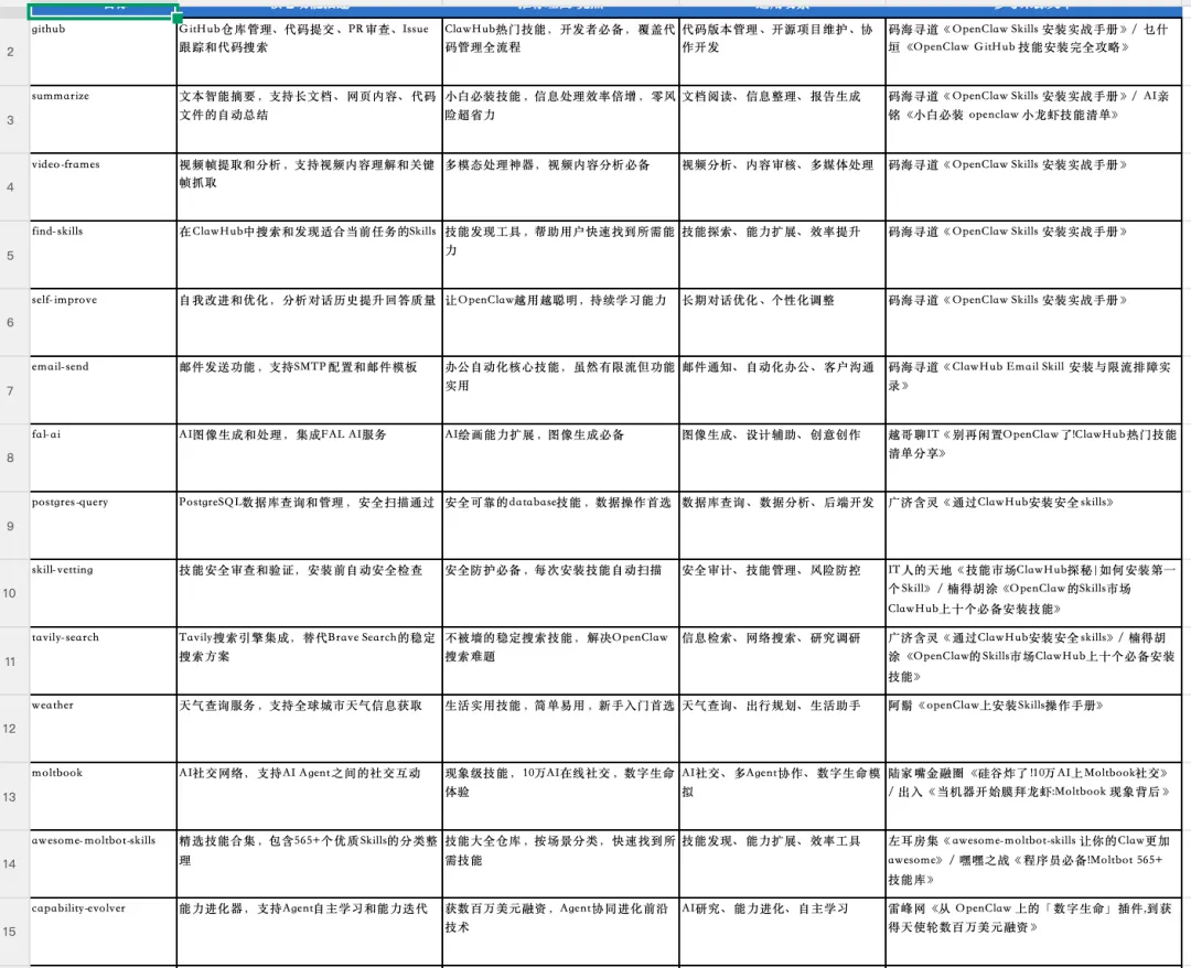 Excel表格化:激活xlsx技能,将提取到的信息整理成一个名为《OpenClaw必装好用Skills清单》的表格。