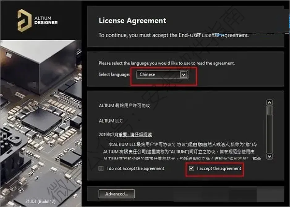 4、先在Select language栏下拉列表中选择“Chinese”,然后勾选“I accept the agreement”,再点击Next;
