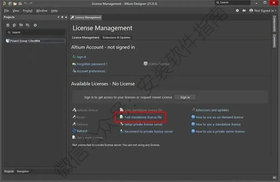 8、因为没有在创建桌面快捷方式,所以在电脑左下角搜索并打开软件,点击【Add standalone license file】;