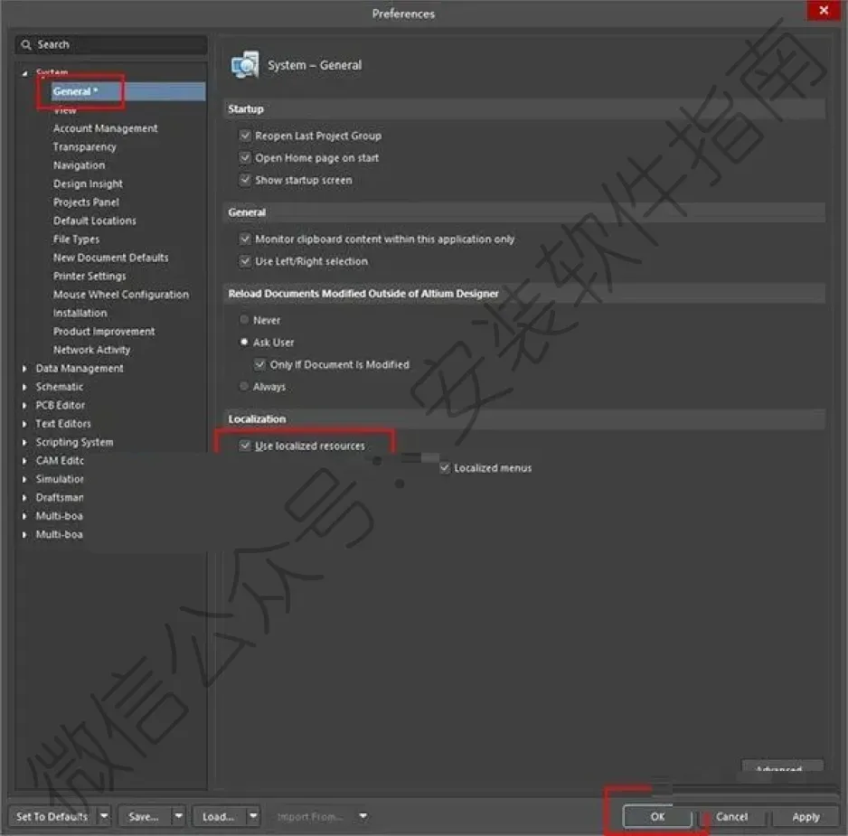 11、接下来进行汉化,点击右上角的齿轮图标,找到General页面,勾选“Use localized resources”,将会弹出一个界面,依次选择OK就可以了;