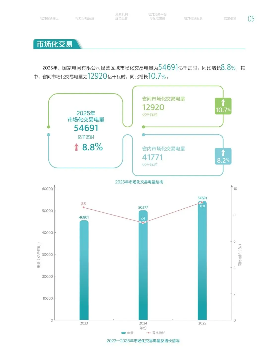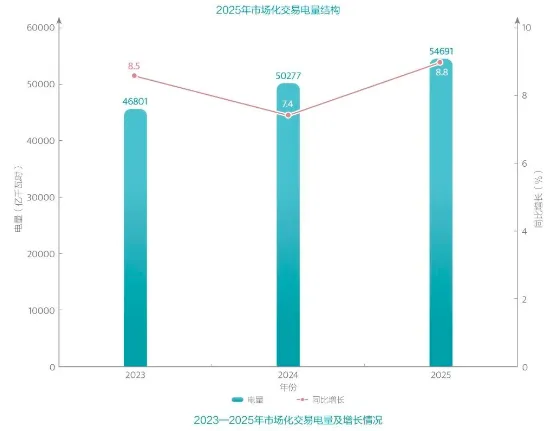 2025年,国家电网有限公司经营区域市场化交易电量为54691亿千瓦时,同比增长8.8%。其中,省间市场化交易电量为12920亿千瓦时,同比增长10.7%。省内市场化交易电量41771亿千瓦时,同比增长8.2%。