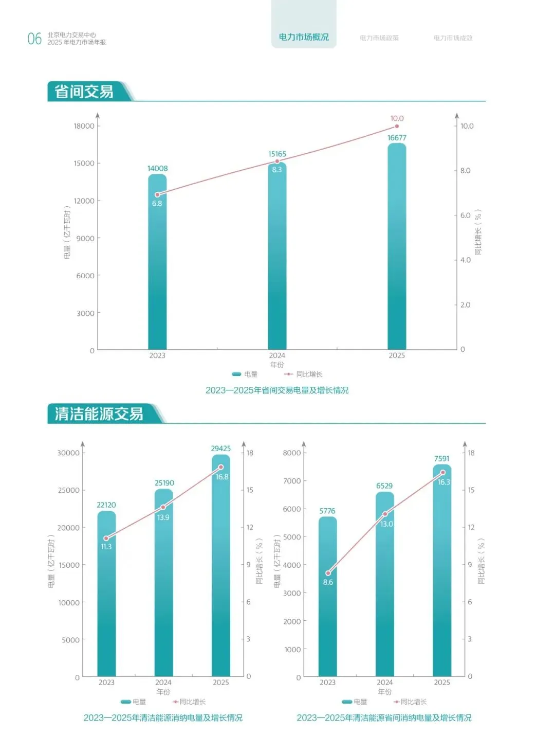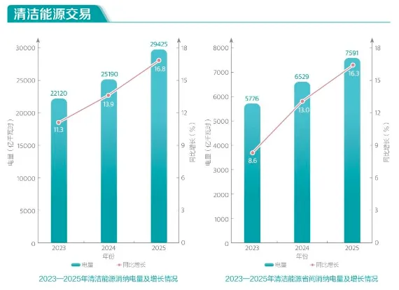 关于清洁能源交易情况,2025年清洁能源消纳电量为29425亿千瓦时,同比增长16.8%。清洁能源省间消纳电量为7591亿千瓦时,同比增长16.3%。