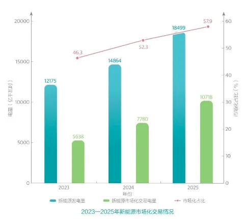 关于新能源市场化交易情况,2025年新能源发电量为18499亿千瓦时,新能源市场化交易电量为10718亿千瓦时,市场化占比57.9%。