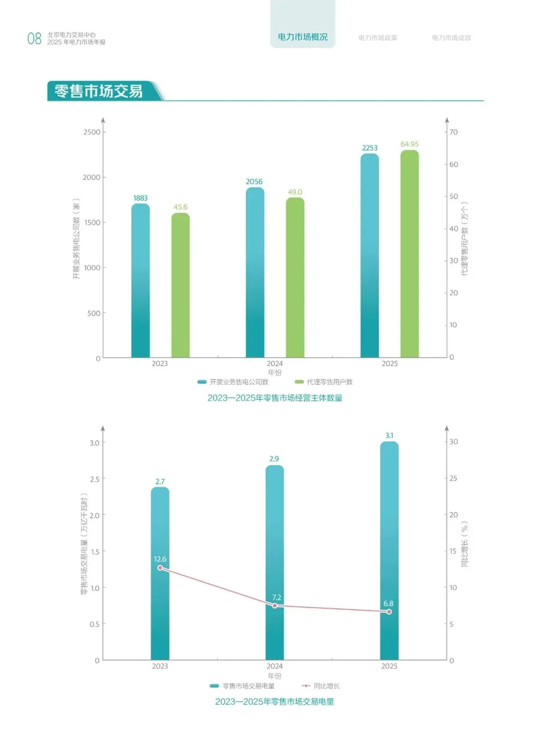 对于零售市场交易,2025年零售市场开展业务售电公司数为2253家,代理零售用户数为64.95万个。零售市场交易电量为3.1万亿千瓦时,同比增长6.8%。