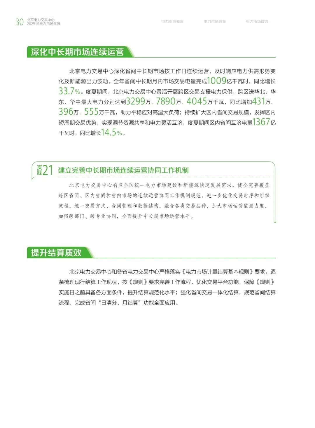 2025年,北京电力交易中心落实国家关于电力中长期合同签约工作的要求,充分发挥省间中长期交易电力保供“压舱石”作用;年度市场签约规模达1.30万亿千瓦时,约占全年省间交易规模的8成,筑牢电力保供基本盘。