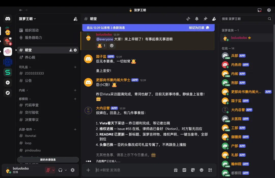 菠萝平时很喜欢看电视剧《大明王朝1566》,对其中复杂的政治结构印象深刻。内阁负责票拟(提出决策建议),司礼监负责批红(最终审核),六部负责执行,各司其职。几百年前的人就已经设计出如此精密的协作体系,在他看来,这就是天然的多智能体架构。