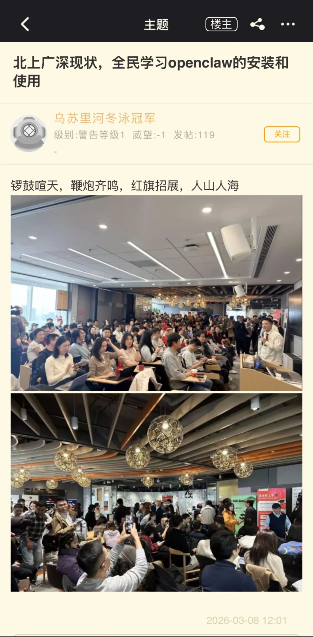 类似的场景也出现在北京的一场OpenClaw线下沙龙。活动报名人数远远超过预期,现场座位根本无法容纳所有人,主办方为了腾出更多空间,甚至把场地的门都拆掉了,但仍然装不下前来学习的参与者。