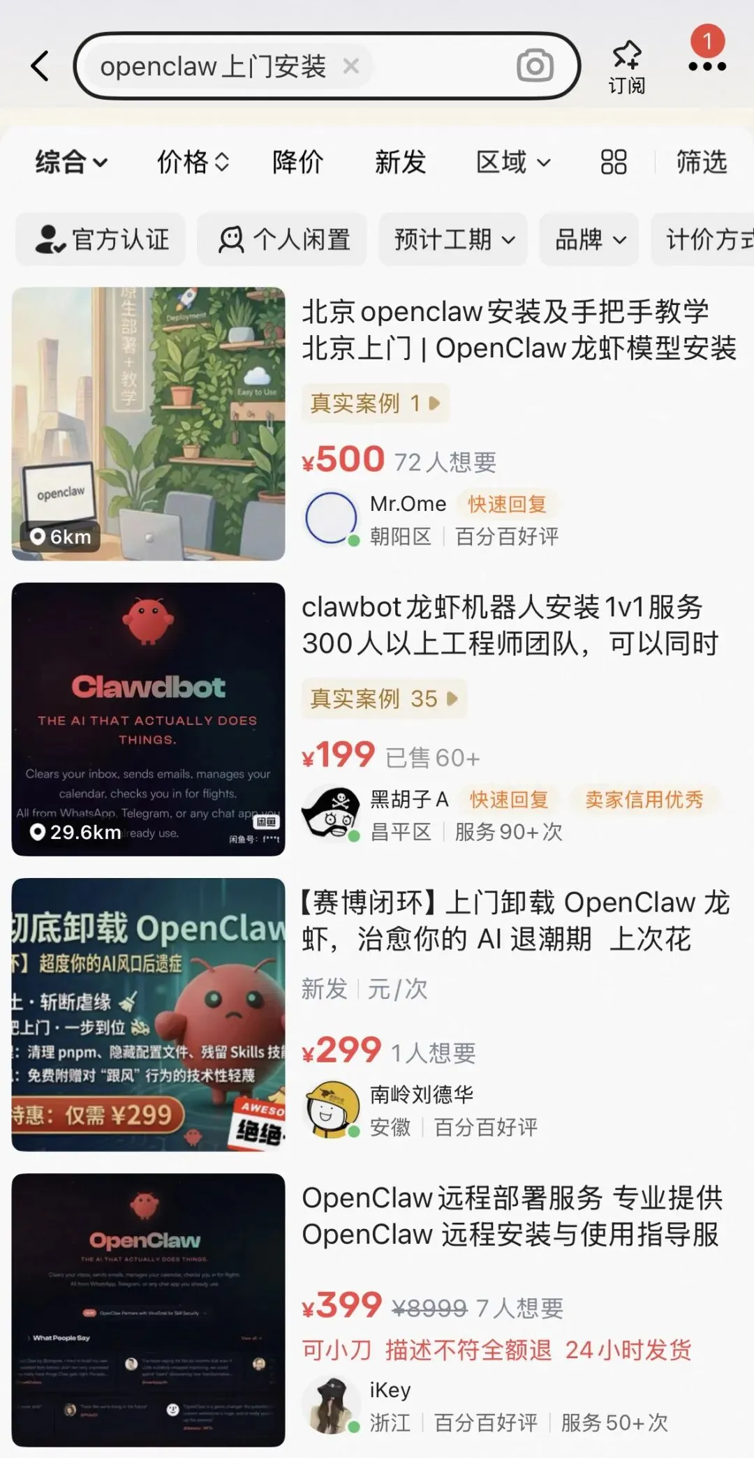 技术的狂热甚至迅速扩散到了二手交易平台。闲鱼原本就被戏称为“海鲜市场”,如今这个称号突然变得字面意义十足。平台上出现了大量与“龙虾”相关的服务,从远程安装到上门部署,再到系统调试和培训,收费从300元到1500元不等。据《北京日报》报道,一些服务商甚至宣称,仅靠帮人安装OpenClaw几天就赚了26万元。