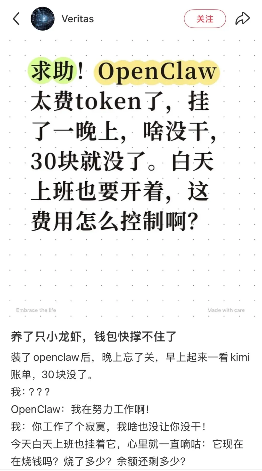 当这些计算过程在后台同时发生时,Token消耗的速度往往远远超过用户的想象。像Vicky这样的新手“养虾人”,往往会在第一次真正使用智能体系统时,才突然意识到一个事实:这只AI龙虾,胃口比大家想象的大多了。