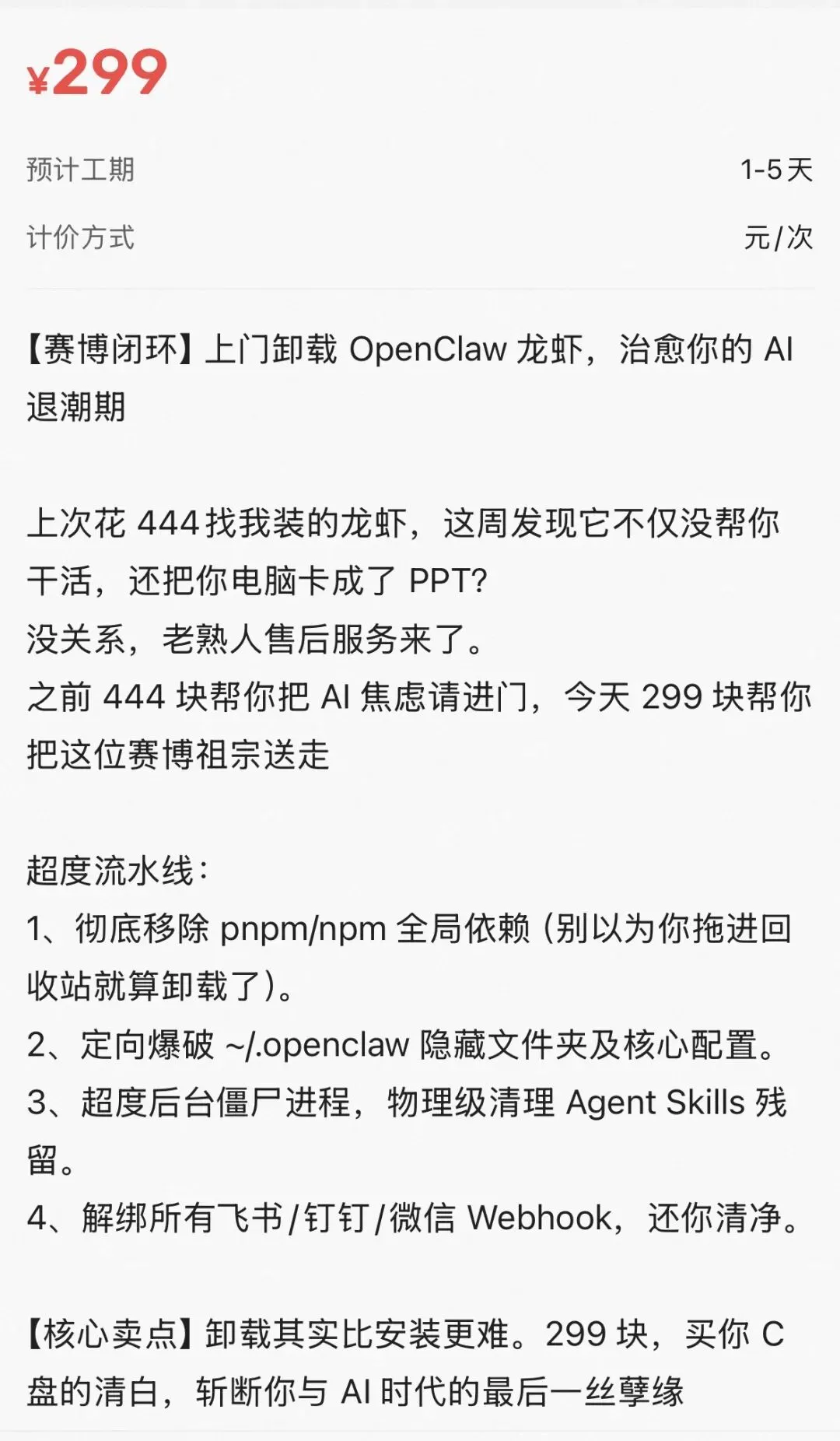 继二手交易平台上“龙虾上门安装服务”走红之后,另一种生意很快出现了——上门卸载OpenClaw,据二手交易平台数据显示,该服务已经售出了3单。