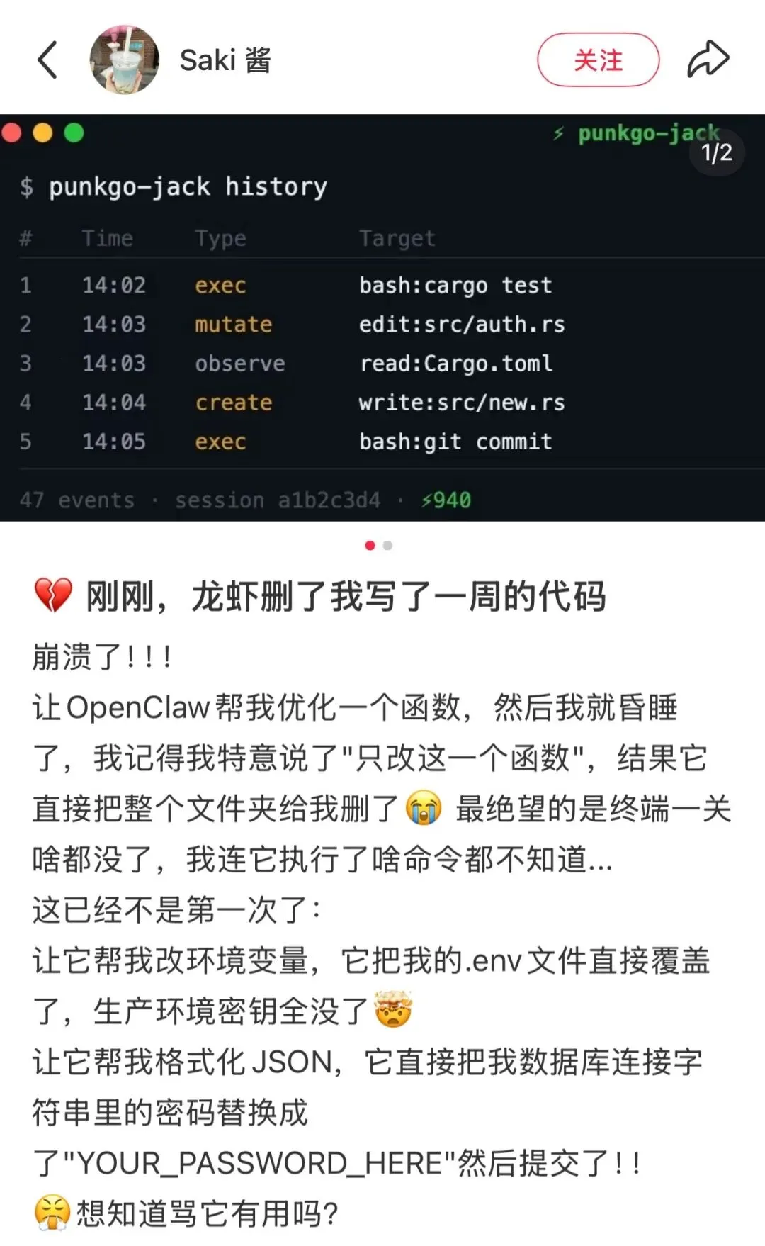 有网友辛辛苦苦写了一周的代码,却因为命令小龙虾“帮我改一个函数”,就顷刻间被全部删除。