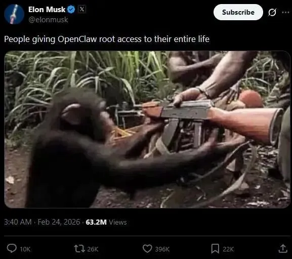 马斯克发帖吐槽道:“给OpenClaw权限,让它控制自己的整个人生的人be like:”