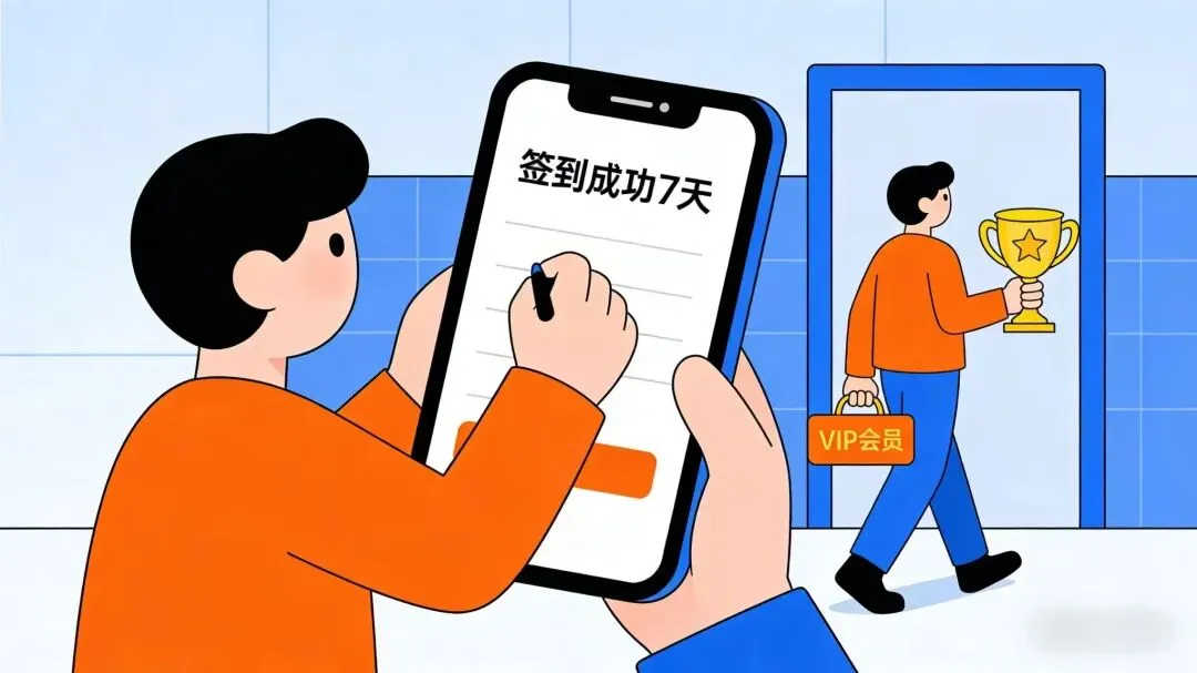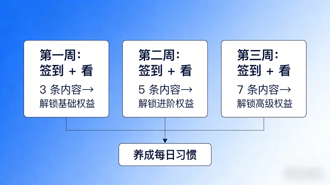 第一周: 签到 + 看3条内容 → 解锁基础权益