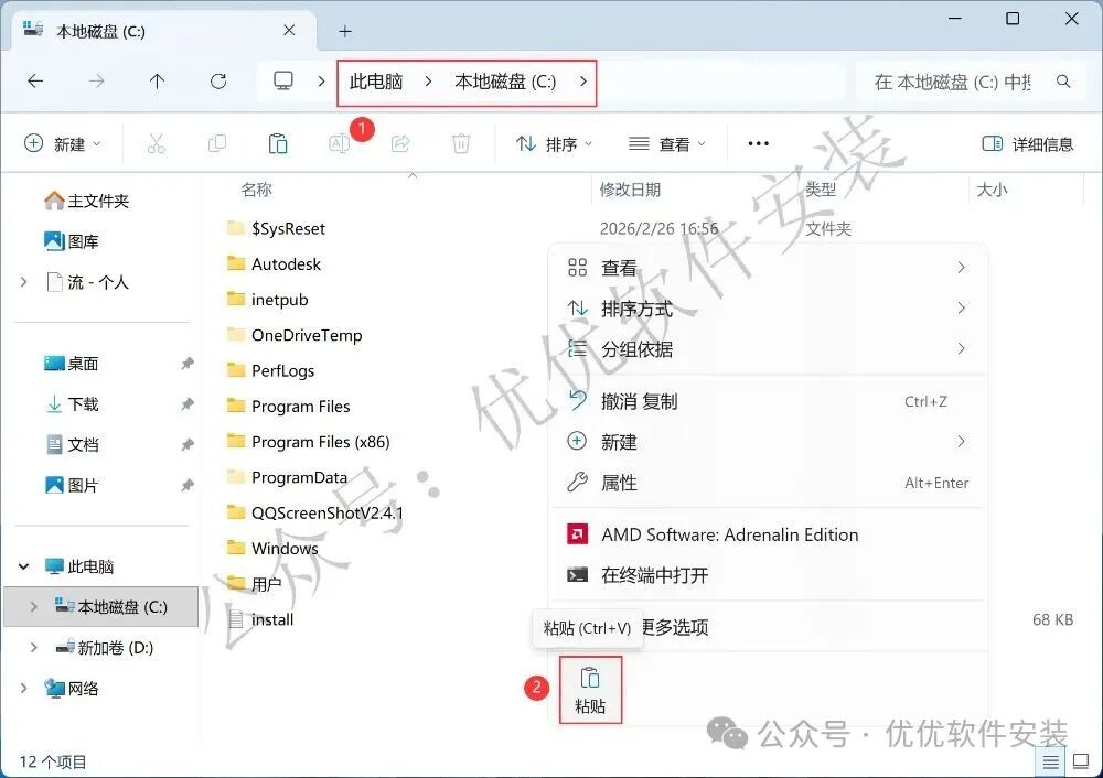 8、打开本地C盘,再右键文件夹的空白处,点击【粘贴按钮】